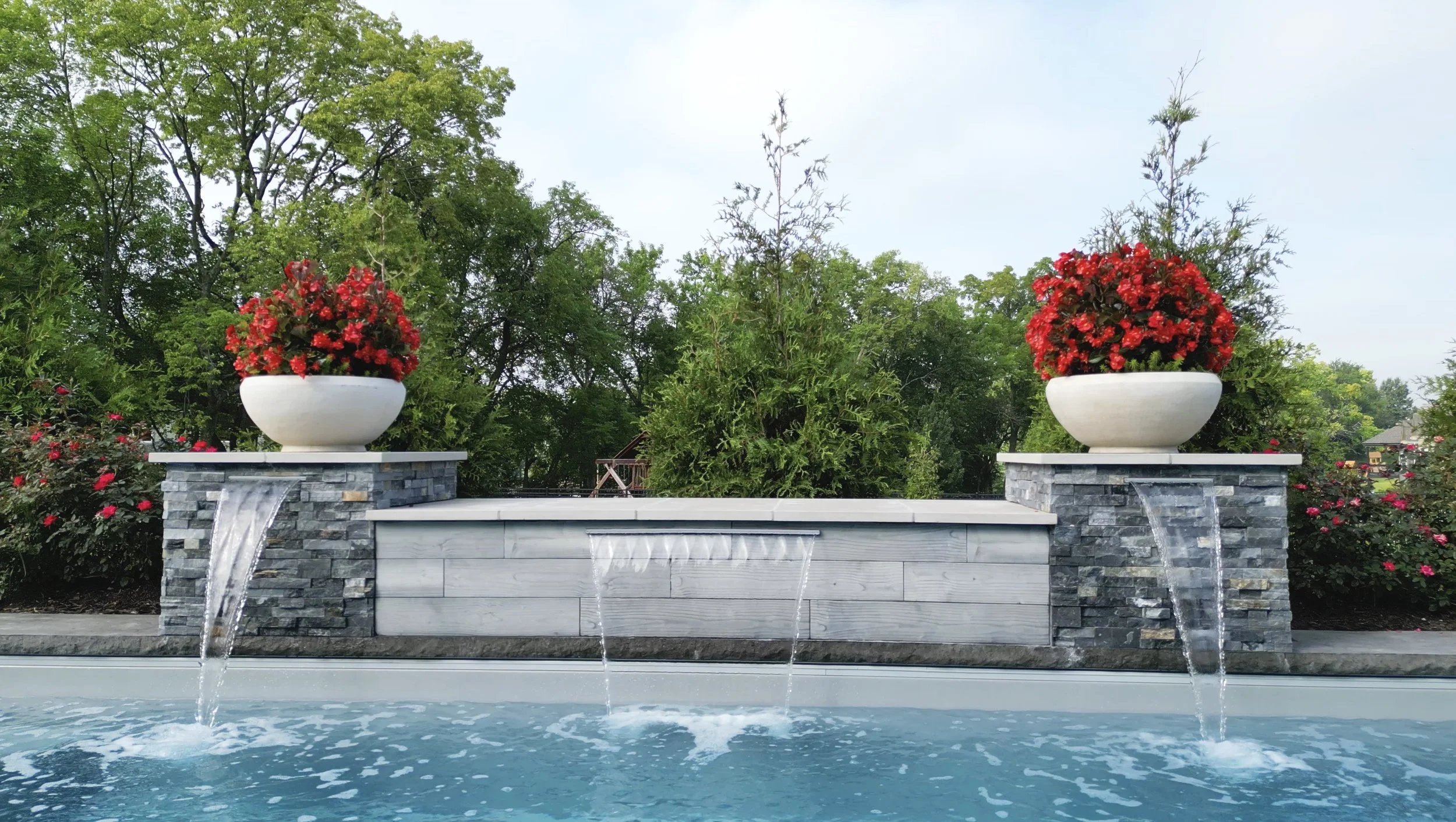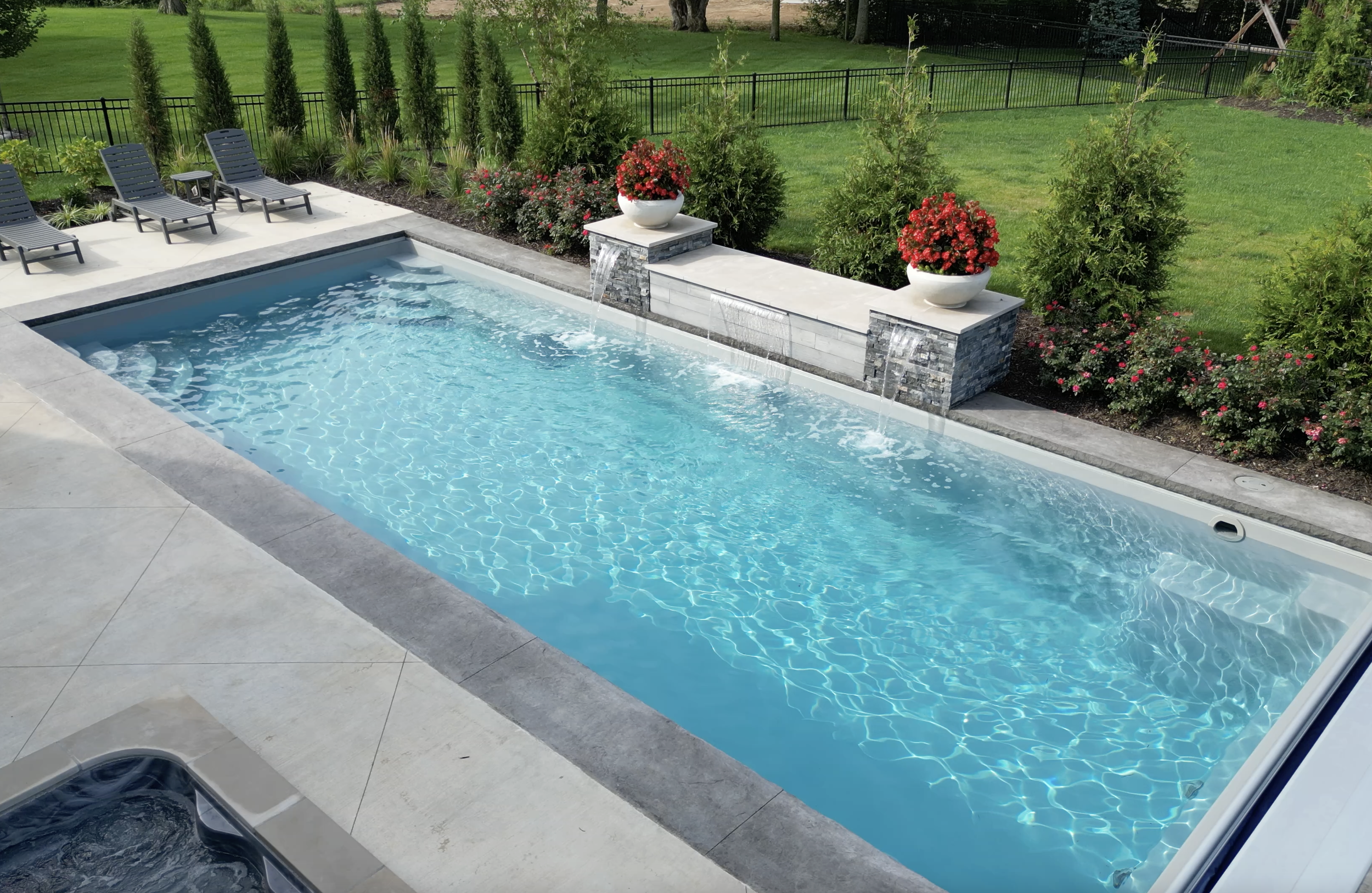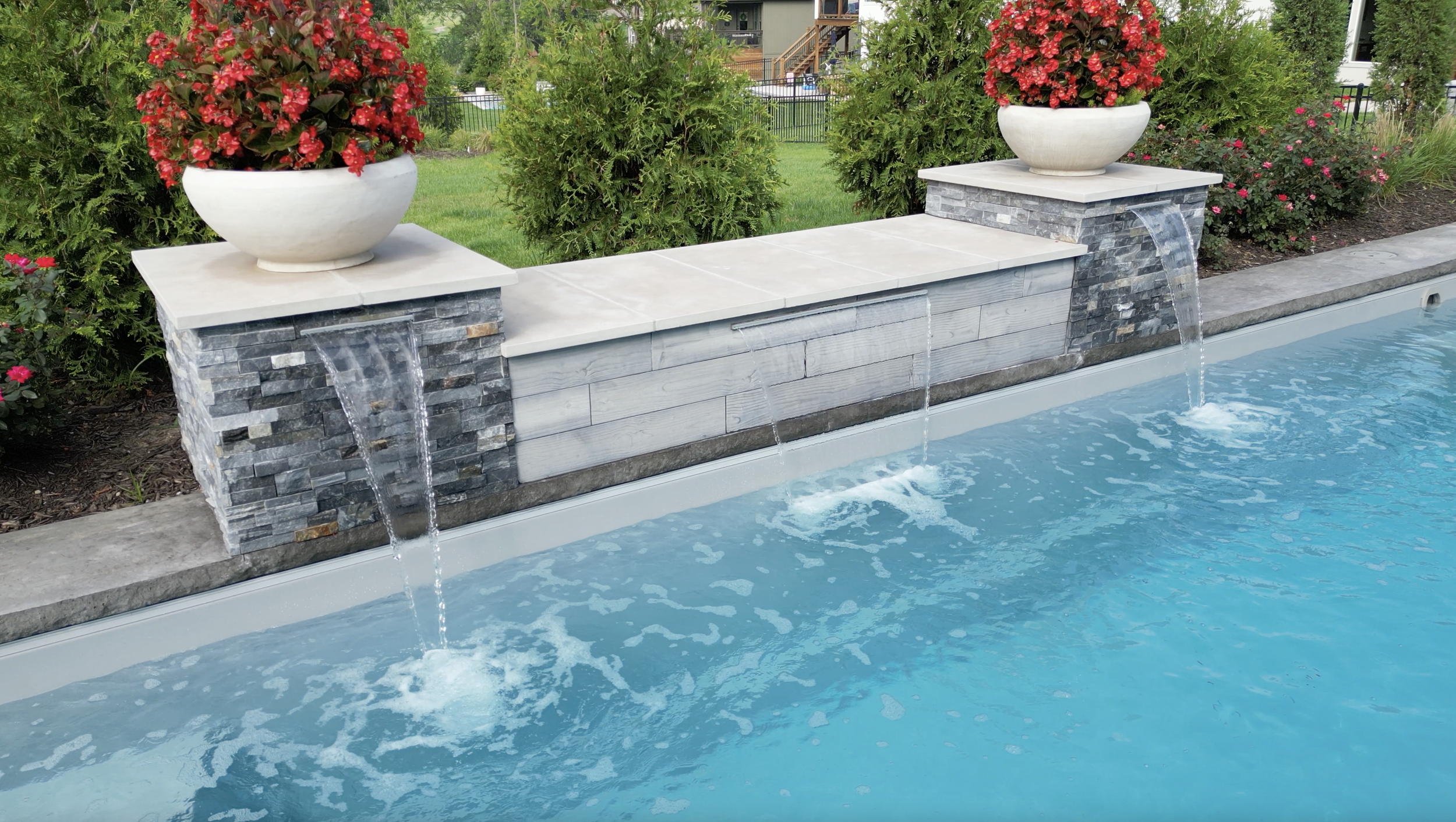 Thursday Pools - Goliath 16x37 Diamond Color12 Jet Square SpaAutomatic Safety Cover14’ Water Feature Wall