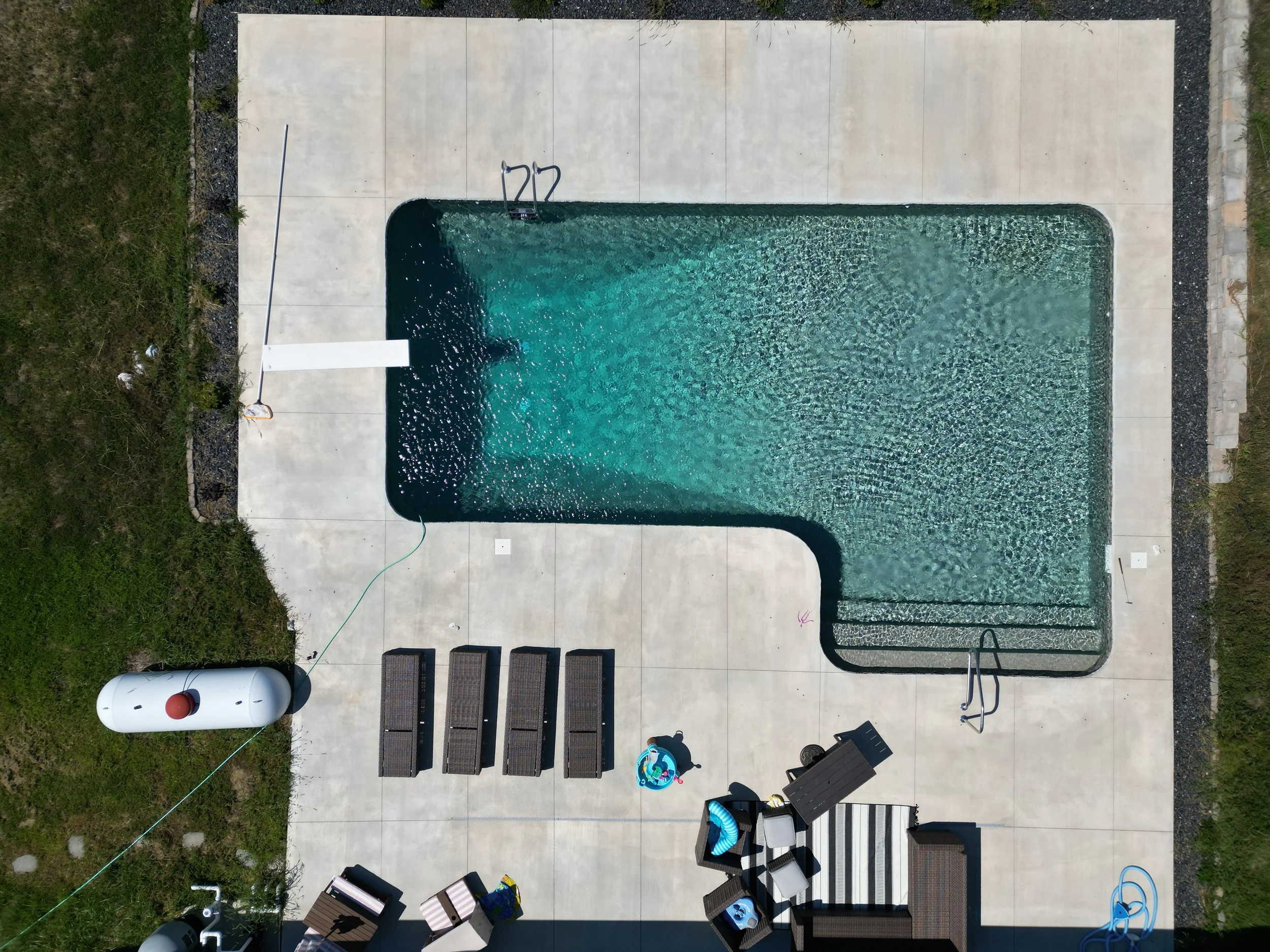 16x40x16x26 L-Shaped Diver Liner: GLI Sedona with Sand GuniteFull Length StepsDiving BoardDeep End LadderFigure Four Handrail